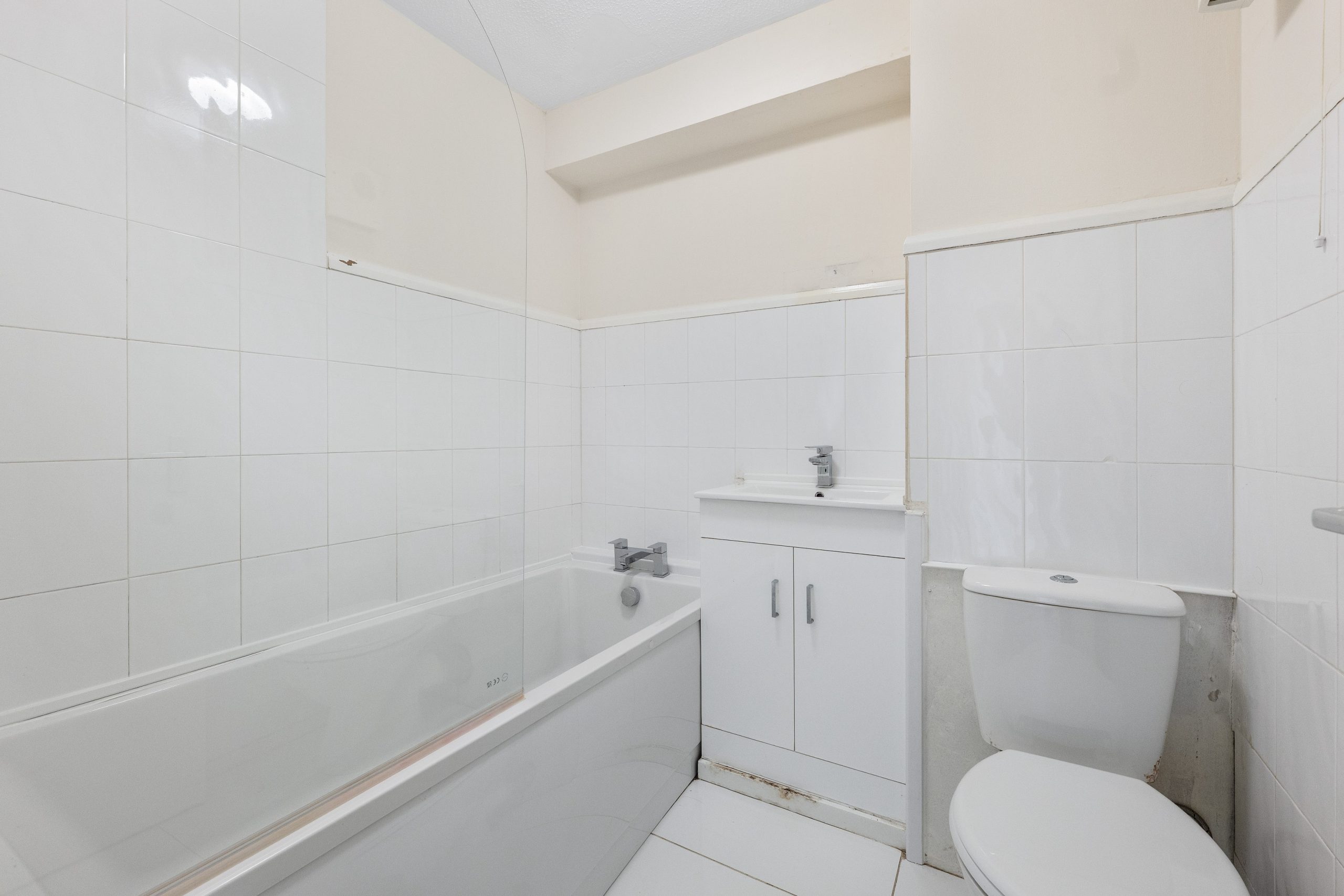 The tiled bathroom features a three piece suite consisting of a toilet, sink and bath with a shower overhead.